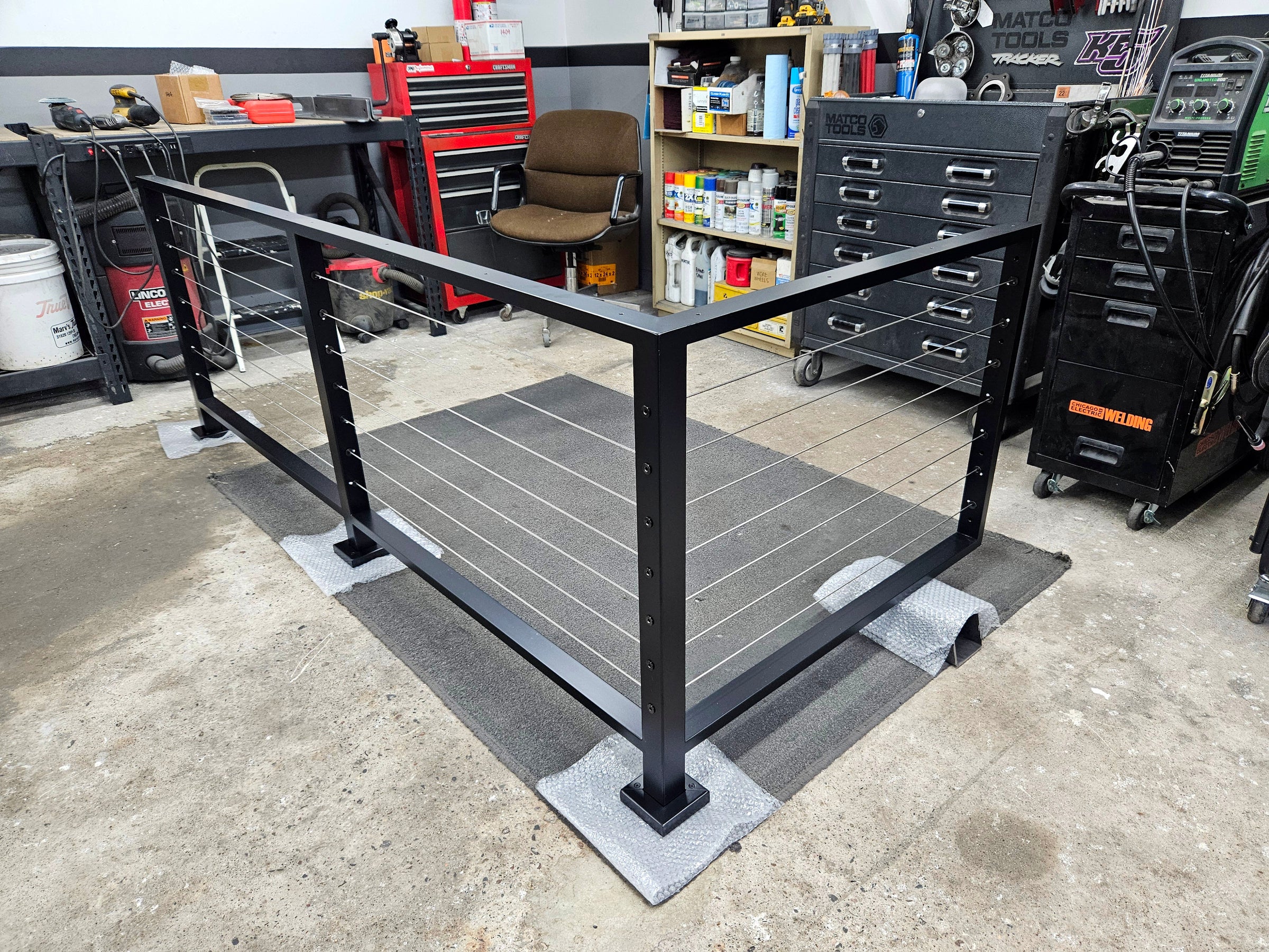 Aluminum railing with satin black powder coat, stainless steel cable, black cable ends, and custom interlocking floor plate covers. Also included countersunk holes in the top tube for a wood top rail.
