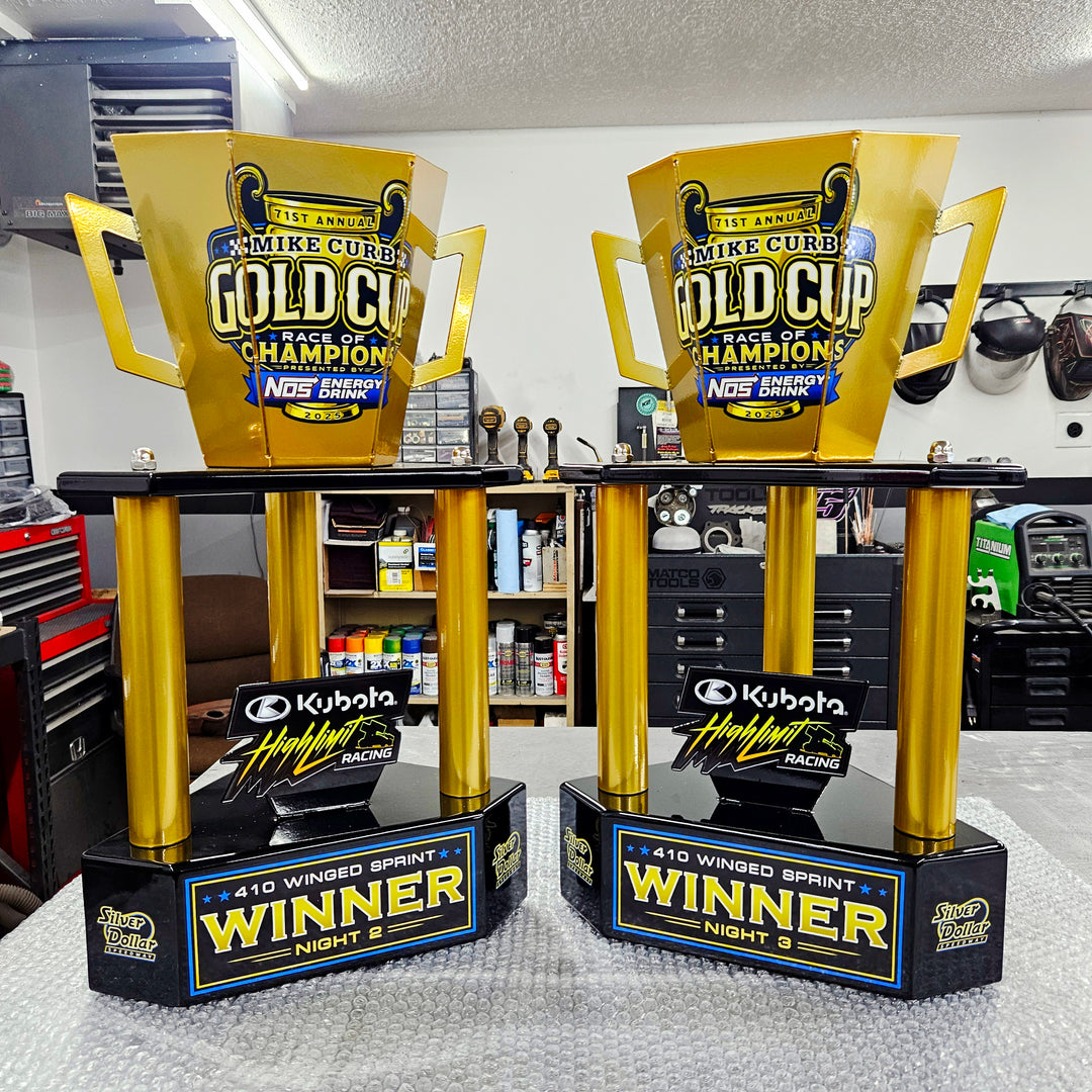 Custom designed sheet meal gold cup, gloss black and gold powder coat, and vinyl wrap featuring track and sponsor logos.