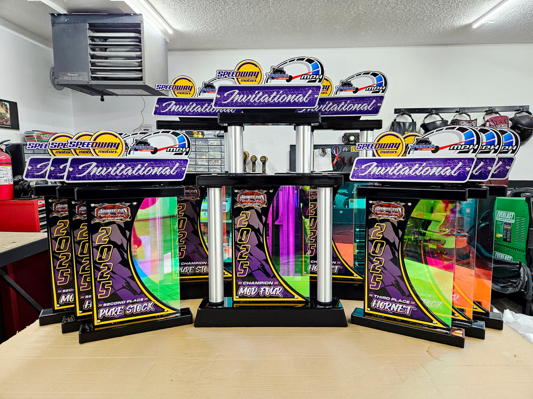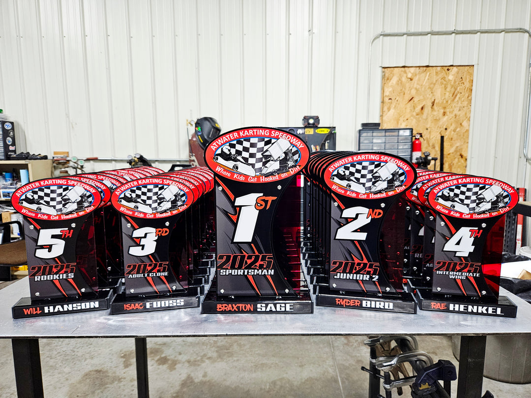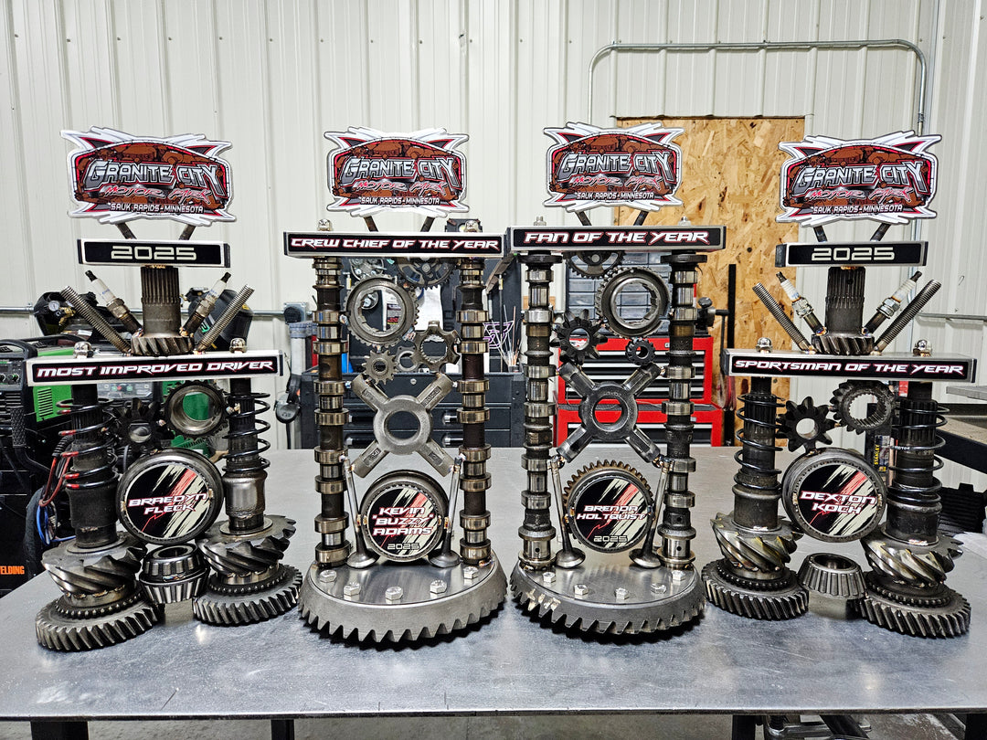 Our famous scrap metal trophies made with recycled gears, shafts, bearings, and more. Complimented by satin stainless steel plaques and tubes, and finished off with custom vinyl decals.