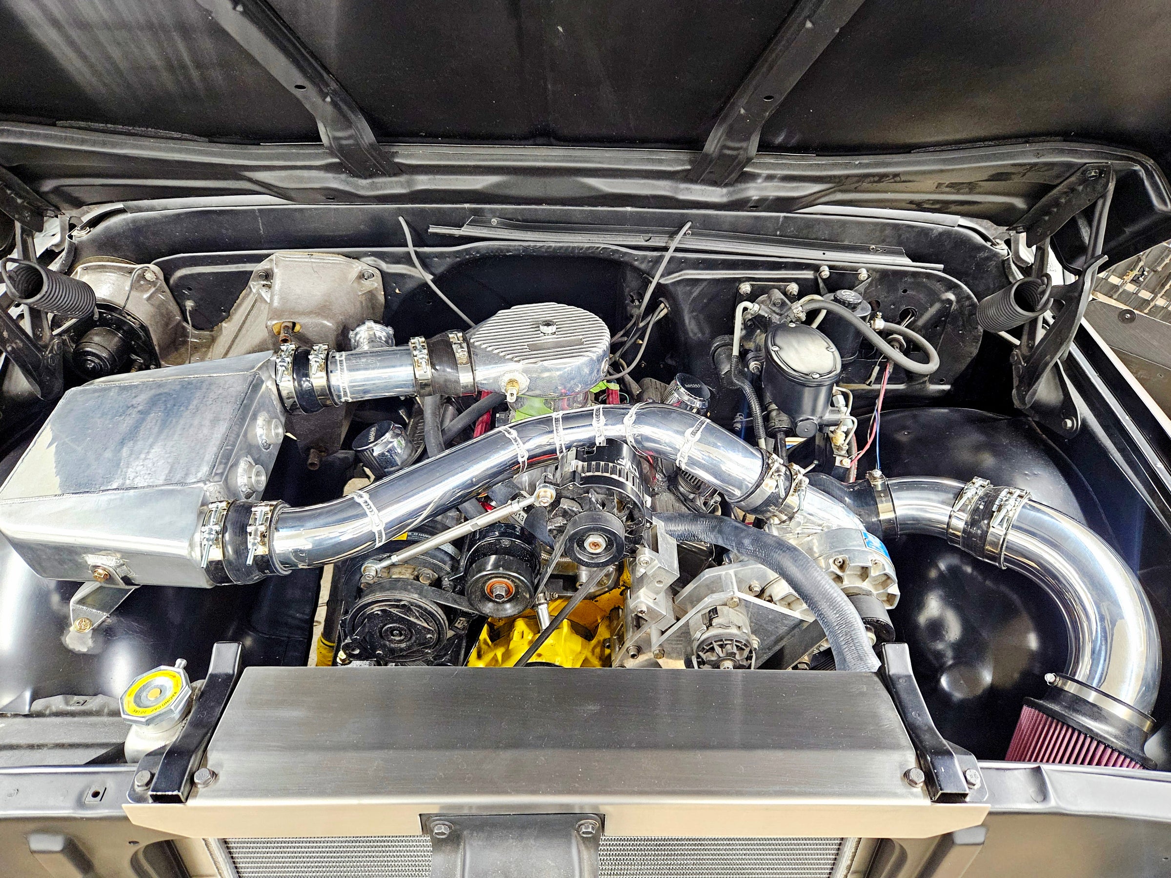 This project featured a powder coated steel intercooler mount, aluminum hot side, cold side, and supercharger intake, as well as a custom stainless upper radiator cover, powder coated steel transfer case crossmember & new rear shock mounts.