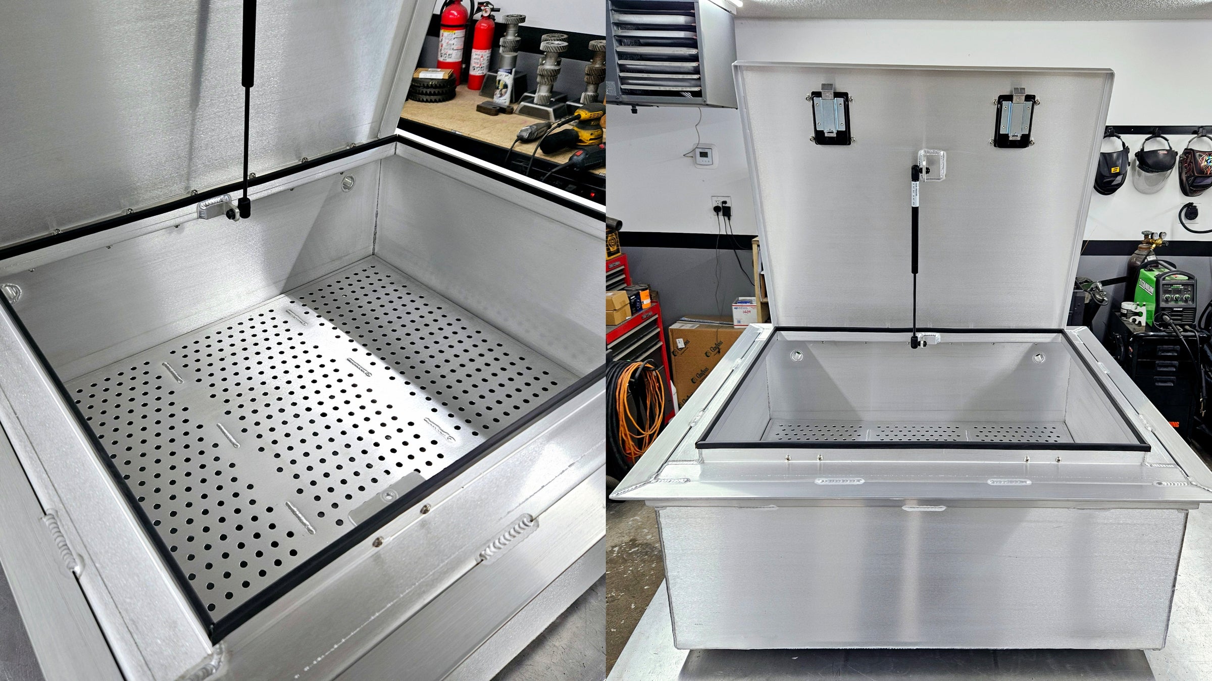 Designed and built entirely in-house featuring an aluminum tube frame, painted aluminum cladding, powder coated aluminum diamond plate trim, 3 lockable weather-proof doors with gas struts, interior and exterior lighting, and compatible mounts for Lock-and-Ride systems.